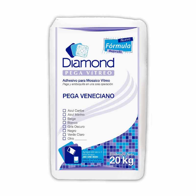 DIAMOND PEGA VÍTREO es un adhesivo reforzado especial para mosaicos vítreos y cuya superficie no presente absorción alguna, en colocaciones nuevas y colocación de recubrimiento nuevo sobre otro ya existente. Con DIAMOND PEGA VÍTREO se obtiene en una sola operación la total adherencia y perfecto rejuntado/emboquillado del mosaico veneciano. DIAMOND PEGA VÍTREO tiene la característica de evitar la formación de algas, pues contiene un compuesto ALGICIDA en su formulación.